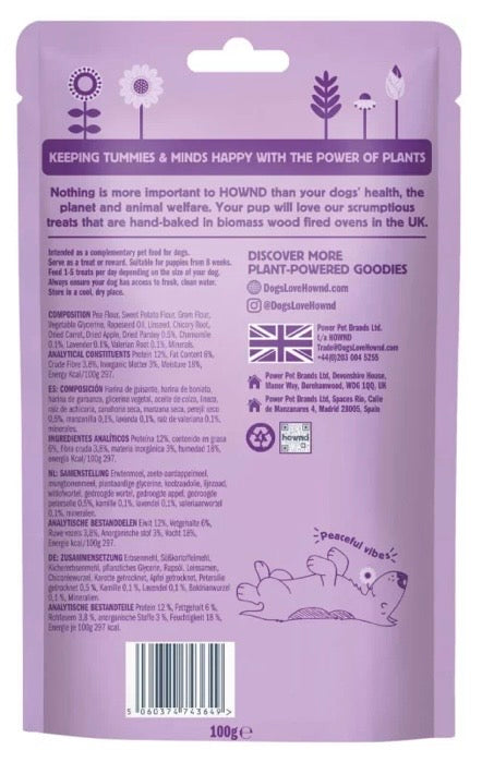 Hownd Keep Calm Wellness Dog Treats are infused with lavender, camomile and valerian root, all of which are renowned for their soothing properties to help your best friend unwind. Camomile and Lavender are known to aid stress help provide relief to anxious dogs. These treats help dogs relax and find their inner peace, providing a sense of tranquillity during stressful situations such as when being taken to the vet, during road trips or firework season.